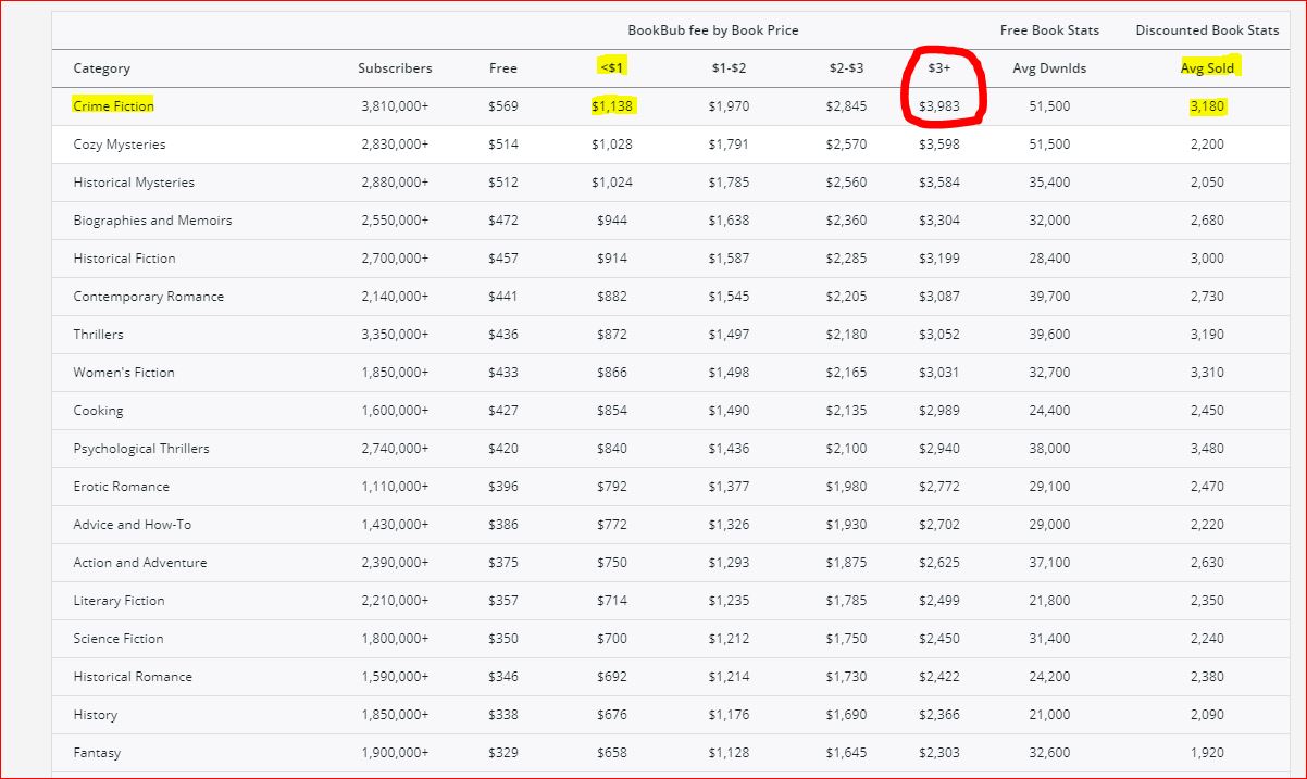 Crime fiction has the largest number of list subscribers and has the second largest number of average expected sales on a deal. Obviously, you won’t get a return advertising a free book, so we are not even looking at those stats. But let’s say you discounted your $4.99 to just $0.99 That will cost you $1138 for your BB deal. Now, the average sales one can expect on crime fiction (which BB openly admits) is only 3180. If you do the math, that will net you just $1113 in average sales for your book when sold at $0.99 with a 35% royalty rate from Amazon. That is less than what you paid BB to advertise the book. Now, if you want to actually make money, you could toss $3983 their way and potentially gross over $8K in profits (netting around $4880 after you subtract the BB deal expense).